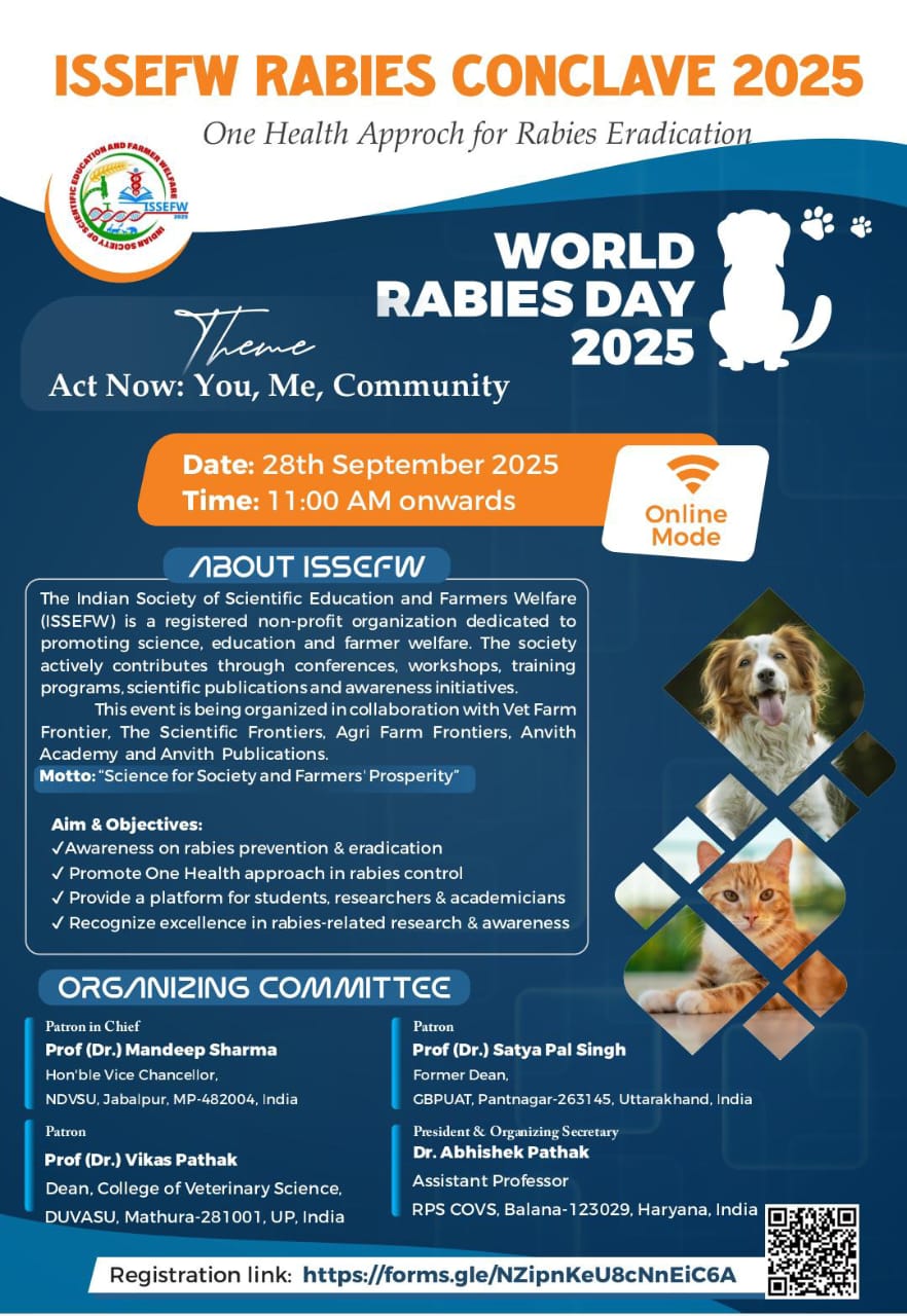 Indian Society of Scientific Education & Farmer Welfare (ISSEFW) is the association of researchers (Veterinary, Medical, Agricultural and allied sciences), health practitioners and volunteers for welfare of the society.